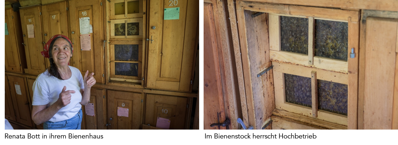 Es summt und brummt im Bienenhaus von Renata Bott, idyllisch am Waldrand gelegen fernab im hintersten Teil des Münstertals auf 1660 m ü. M. Sommer ist Hochsaison für die fleissigen Bienen, es wird ausgeflogen und Nektar gesammelt was das Zeug hält. Die Ordnung im Bienenstock ist überaus faszinierend: Königin, Drohnen und Arbeiterinnen wissen ganz genau, was zu tun ist.